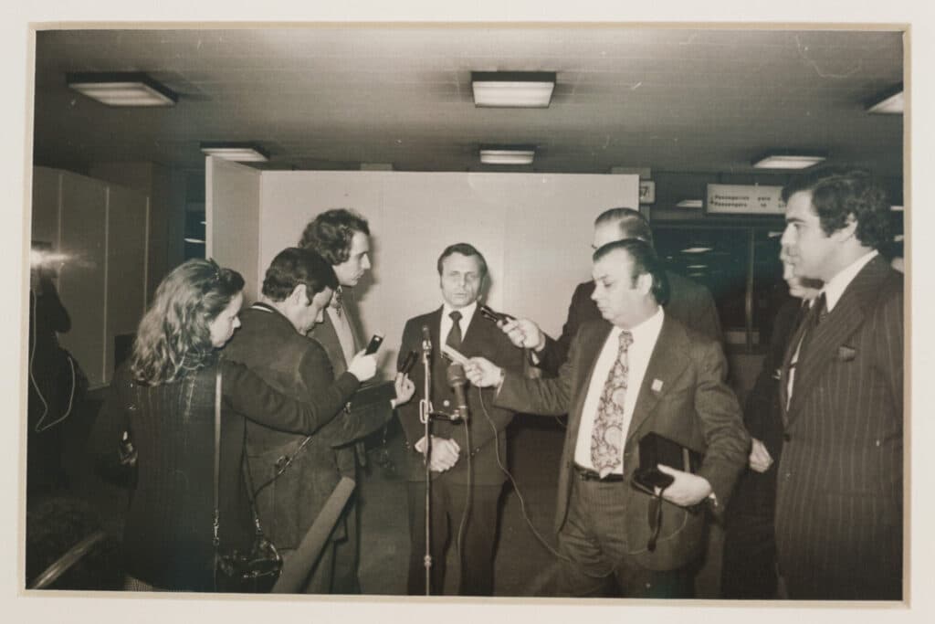 Na imagem, um grupo de jornalistas recolhe os comentários e respostas a perguntas do embaixador dos Estados Unidos em Lisboa, Frank Carlucci, na sua chegada à capital em Janeiro de 1975. Entre eles, a segurar num dos microfones, de gravador na mão, está um querido colega: Carlos Pontes, companheiro na Reuters.