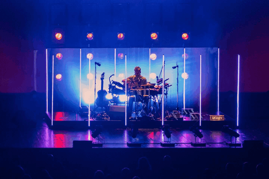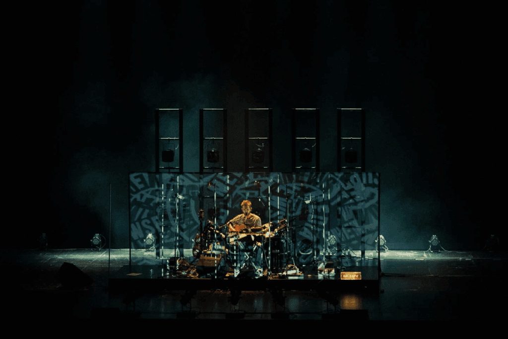 Vê-lo ao vivo, porém, é outra experiência: a construção paciente das canções, camada sobre camada, num artesanato sonoro que se faz de loops sucessivos, mãos que saltam de teclados para guitarras, de pedais para a percussão e para pequenos instrumentos quase escondidos.