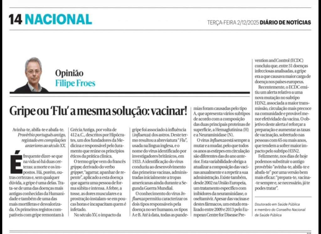 Ironias da vida: hoje mesmo, o doutor Froes publica no Diário de Notícias um artigo de opinião, “Gripe ou Flu a mesma solução: vacinar!”, onde apela fervorosamente à vacinação no seguimento de um alerta do ECDC — o centro europeu de prevenção e controlo das doenças — sobre uma nova mutação do subtipo H3N2. Alega que tal mutação implica uma “provável menor efectividade da vacina”, mas garante, paradoxalmente, que “o objectivo deste alerta é reforçar a preparação e aumentar as taxas de vacinação, sobretudo nas pessoas com 65 ou mais anos, que tendem a sofrer maior impacto pelo subtipo H3N2”.