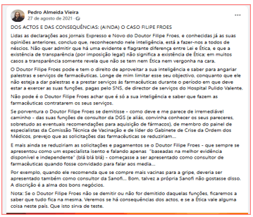 Dos vários textos (quase uma vintena), chamou-me a atenção este – considerado difamatório (logo se verá na sentença) pelo Ministério Público, a Ordem dos Médicos e, claro, o doutor Filipe Froes —, escrito em 27 de Agosto de 2021, e que reza assim: ↓