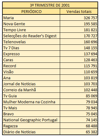 As revistas do segmento do lazer e televisão eram então rainhas e senhoras. No terceiro trimestre de 2001, as revistas Nova Gente, Tempo Livre, Selecções do Reader’s Digest, Telenovelas, TV 7 Dias, Caras e Ana vendiam, cada uma, mais de 100 mil exemplares por edição. Mas mesmo os jornais de informação generalista ou especializada não se portavam nada mal. O Expresso atingiu, nesse período, vendas da ordem dos 137 mil exemplares – mesmo assim já longe do seu máximo esplendor: no terceiro trimestre de 1995, o semanário fundado por Pinto Balsemão – e que teve Marcelo Rebelo de Sousa como director entre 1979 e 1981 – alcançou os 169.454 jornais vendidos por edição.