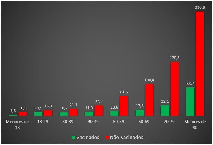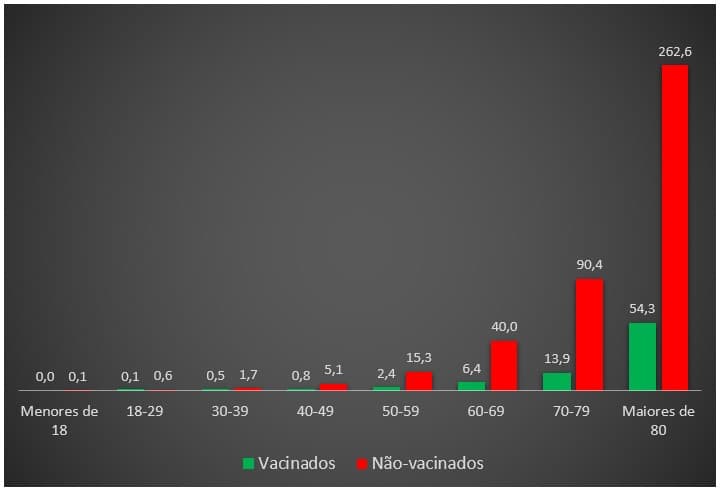 A proporção nos grupos etários inferiores é sensivelmente idêntica, mas pouco relevante se se usar, em vez da unidade “por 100.000 habitantes”, a mais usual percentagem (por 100 habitantes). Nesse caso, o risco de morte de pessoas na faixa etária dos 30 aos 39 anos foi, no período em análise, de apenas 0,0005% se vacinada, e de 0,0017% para os não-vacinados do mesmo grupo etário.