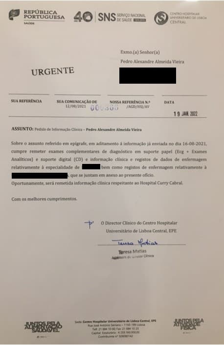 Sei sim que o paciente Pedro Alexandre de Almeida Vieira deveria mesmo agradecer, se não fosse isso um acto algo esquizofrénico, ao jornalista Pedro Almeida Vieira por aquele artigo de opinião, escrito no dia 18 de Janeiro de 2022, que teve rápidos resultados: no dia a seguir, o CHULC classificou a solicitação como URGENTE, e logo a seguir, e em carta registada, enviou os documentos pedidos pelo dito (im)paciente há mais de seis meses.