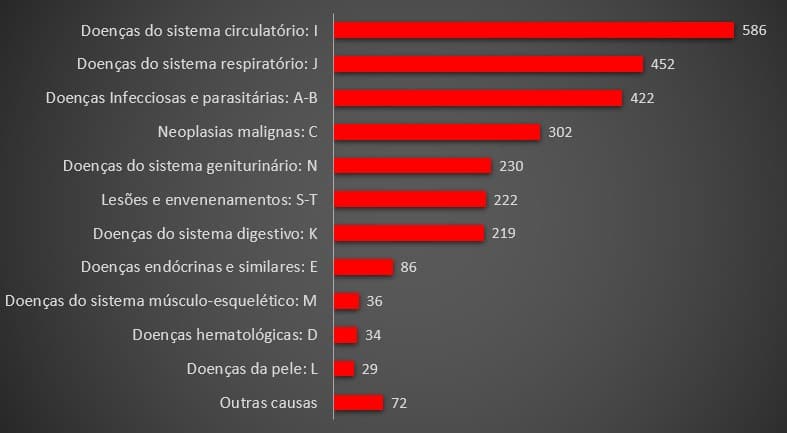 De facto, considerando os grupos de doenças constantes do CDI da OMS, identificam-se 586 óbitos por covid-19 de pessoas que foram inicialmente internadas por doenças do aparelho circulatório (código iniciado pela letra I), das quais 41 com enfartes agudos do miocárdio, 160 com AVC isquémicos, 11 com AVC hemorrágicos e 140 com crises de hipertensão.