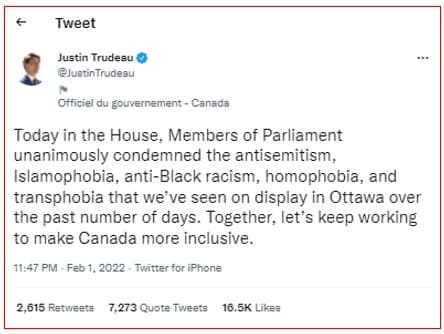 Anteontem, Trudeau aumentou o tom crítico, congratulando-se no Facebook e Twitter pela condenação unânime no Parlamento do “antissemitismo, islamofobia, racismo anti-negro, homofobia e transfobia que têm sido mostrados em Ottawa nos últimos dias”, lançando um apelo: “Juntos, vamos continuar a trabalhar para tornar o Canadá mais inclusivo”.