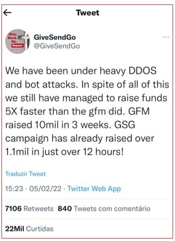 O facto de a GiveSendGo ser claramente de cariz religioso – assume-se como a principal plataforma cristã mundial de angariação de fundos – retira também espaço a ataques sobre extremismos dos protestos contra as políticas restritivas do Governo Trudeau. Em todo o caso, apesar do sucesso da nova campanha de angariação, a plataforma da GiveSendGo tem estado com alguns problemas de acesso, que se deverão, segundo os seus responsáveis, a “fortes ataques de negação de serviço [DDOS attacks] e com bots maliciosos”.