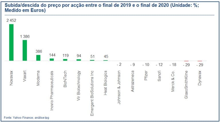 Podemos destacar, desde já, a Novavax, cuja vacina usa uma réplica da proteína S, sintetizada artificialmente do vírus, e que foi apenas aprovada na União Europeia em Dezembro do ano passado. Esta empresa norte-americana viu a cotação das suas acções em bolsa subir 2.450%! De 3,98 USD por acção para 111,51 USD por acção, num espaço de apenas um ano. Um investimento de 100 USD no final de 2019 valeria 2.550 USD no final de 2020.