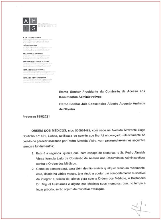 No ofício desta sociedade – A. de Freitas Gomes e Inês Folhadela Sociedade de Advogados R. L. – enviado à CADA, além da acusação de eu estar, “desde há vários meses”, a “adotar um comportamento suscetível de integrar a prática de crimes para com a Ordem dos Médicos, o Bastonário Dr. Miguel Guimarães e alguns dos Médicos seus membros” – mas não identificando as normas do Código Penal que estarei a violar –, o advogado signatário (de assinatura ilegível) insinua sistematicamente de eu estar a agir com interesses inconfessáveis, e mesmo de pretender “instrumentalizar a Comissão de Acesso aos Documentos Administrativos para atingir os [meus] objectivos”. ↓