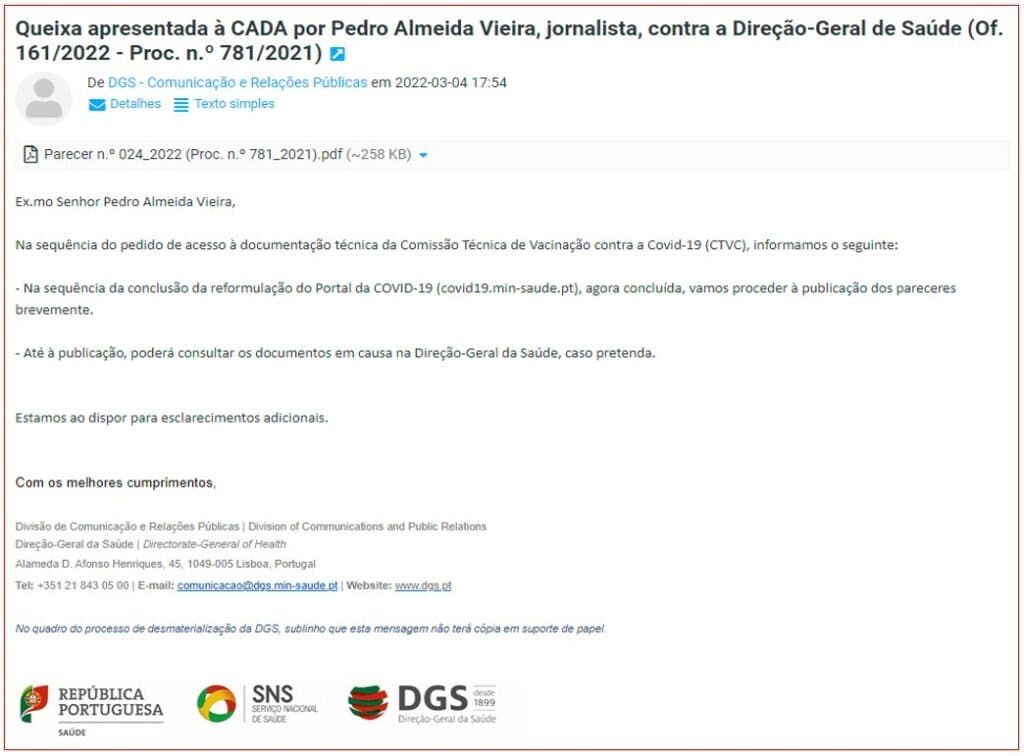Em 26 de Outubro do ano passado, foi endereçado um pedido expresso à DGS, ao abrigo da Lei do Acesso aos Documentos Administrativos (LADA), para “acesso a todos e quaisquer pareceres técnicos, pareceres e outros documentos considerados documentos administrativos” relacionados com a CTVC.