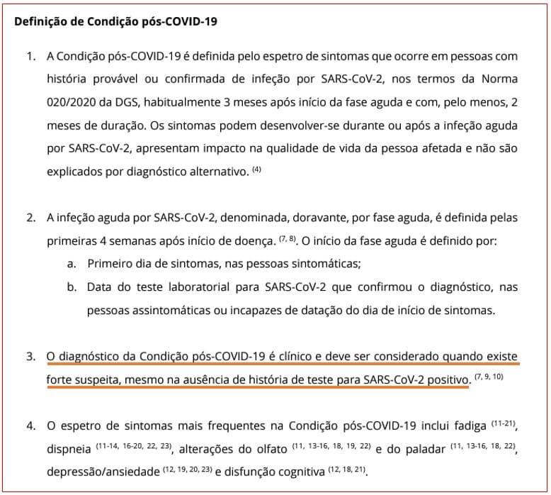 Isto porque uma norma homologada esta quarta-feira pela directora-geral da Saúde, Graça Freitas, determina que o “diagnóstico da condição pós-covid-19 [long covid] é clínico e deve ser considerado quando existe forte suspeita, mesmo na ausência de história de teste para SARS-CoV-2 positivo.”