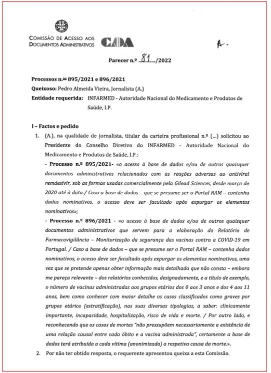 A CADA, porém, considerou que “a informação solicitada” ao Infarmed pelo PÁGINA UM constitui mesmo “documentos administrativos”, e que, conforme fora feito o pedido, não era possível identificar pessoas. Com efeito, o PÁGINA UM solicitou, em concreto, que pretendia, tanto para as vacinas como para o remdesivir, uma “lista de reacções adversas (A, B, C, etc.) do indivíduo 1, 2, 3, etc. (…) de sexo determinado em datas elencadas após a toma de um medicamento concreto”. Ou seja, dados perfeitamente anonimizados.