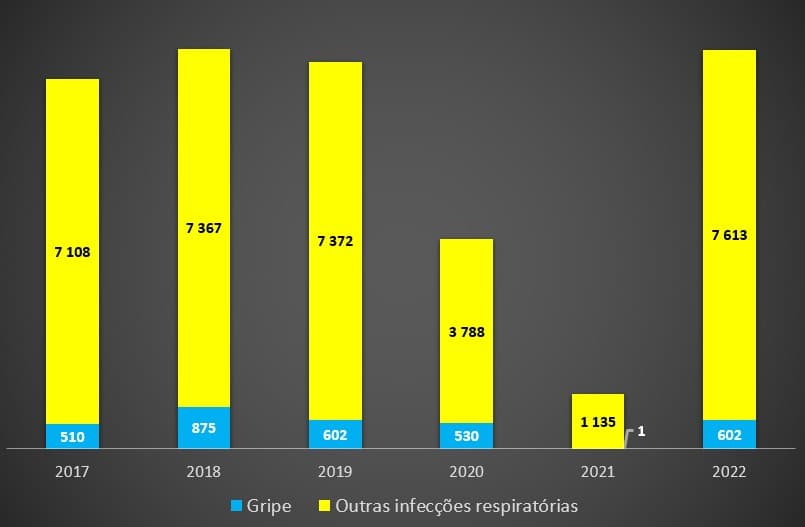 Segundo os dados de monitorização do Serviço Nacional de Saúde (SNS), desde 2017, a recente semana de 15-21 de Março foi aquela com maior número de registos de infecções respiratórias não-gripais ou não-covid: 7.613. São valores acima daqueles que se encontram antes da pandemia, e supera largamente os casos contabilizados no período homólogo de 2020 e 2021: no ano passado registaram-se apenas 1.135 casos; em 2020 somente 3.788. A gripe, por sua vez, foi identificada em 602 casos que chegaram ao SNS; no ano passado, em período homólogo, foi apenas um.