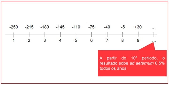 Na figura podemos ver que no primeiro ano a empresa perde 250 Euros; ao longo do tempo, espera-se que vá diminuindo as perdas, até que no 9º ano começa a apresentar resultados positivos, passando, a partir daí, a crescer todos os anos a 0,5%.