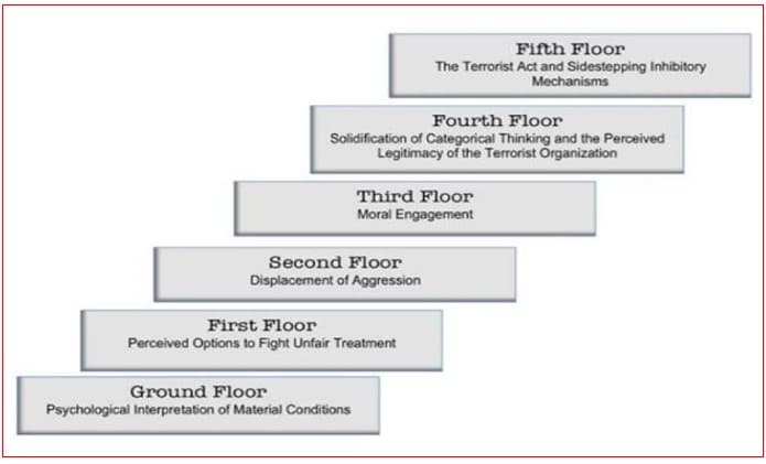 Destacam-se pela relevância, contudo, dois níveis, a saber o de base (“ground floor”), “Psychological Interpretation of Material Conditions”, onde a maioria das pessoas se encontra, e as considerações de injustiça percebida são determinantes, logo o nível mais importante onde as acções individuais e societárias de prevenção da radicalização se devem focar; e o último (“5th floor”), “The Terrorist Act and Sidestepping Inhibitory Mechanisms”.