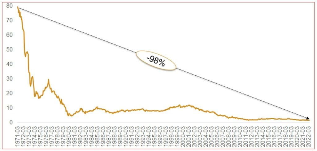 Em 1971, depois de ter financiado a guerra do Vietname com a impressora do seu Banco Central, sem qualquer respaldo por Ouro, os EUA foram obrigados a terminar a convertibilidade do USD no metal amarelo. Desde então, o USD perdeu 98% do seu valor!