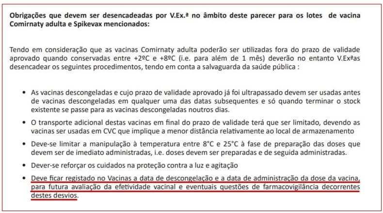 E no Portal Infomed, e no caso do resumo das características do medicamento da vacina Comirnaty/Pfizer, além de se elencar de forma exaustiva as exigentes condições de conservação, salienta-se que, após descongelação, “os frascos para injectáveis por abrir podem ser conservados durante um total de 10 semanas a uma temperatura entre 2 oC e 8 oC, nunca ultrapassando o prazo de validade (VAL) impresso”.