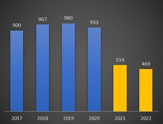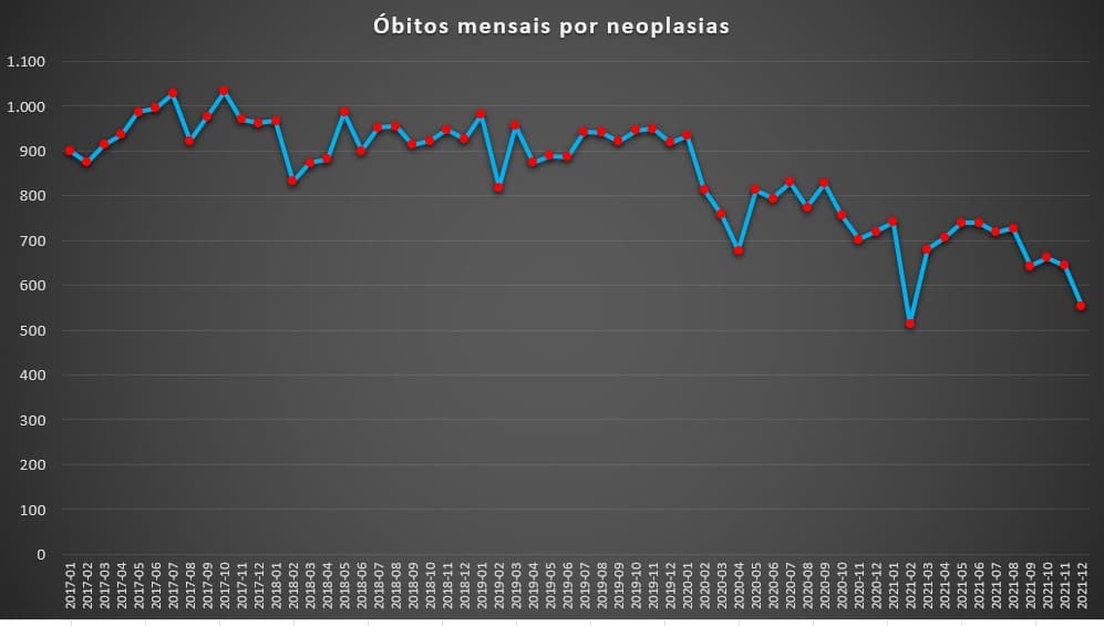 No mês de Fevereiro do ano passado, a queda ainda foi mais notória: 514 óbitos, um valor perfeitamente atípico. Nos meses seguintes, o padrão de anormalmente baixa mortalidade por cancros manteve-se. Sempre abaixo dos 750 óbitos até Agosto, e a partir de Setembro ainda mais baixo. No último mês do ano passado, em Dezembro, as mortes por cancro nas unidades de saúde foi de 554. E em Janeiro deste ano situar-se-ia nos 469 óbitos. Note-se que, nos anos anteriores à pandemia, esta doença matou 900, 967, 980 e 933 pessoas, respectivamente no primeiro mês dos anos de 2017, 2018, 2019 e 2020 – ou seja, antes da pandemia.