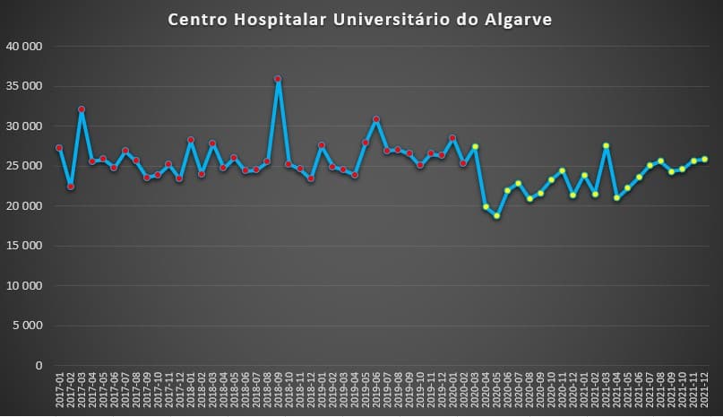 Na mesma linha se encontra o Centro Hospitalar Universitário do Algarve – que integra os hospitais de Faro, Portimão e Lagos –, que após uma repentina descida de um pouco mais de 20% nos dias de internamento entre Março e Abril de 2020, foi depois caminho para uma “normalidade” pré-pandémica.