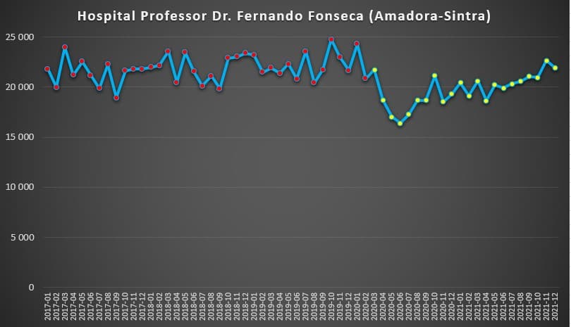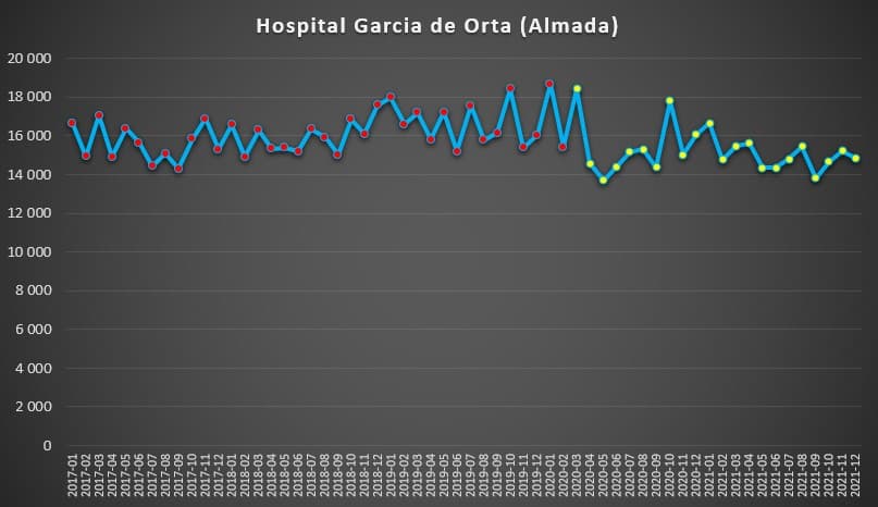 No Hospital Garcia de Orta, em Almada, a pandemia não trouxe alterações relevantes na pressão hospitalar. É certo que houve uma queda percentualmente relevante logo no início da pandemia (entre Março e Abril de 2020), mas a a seguir as variações estão dentro de um padrão de “normalidade”.