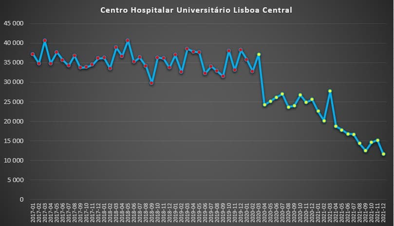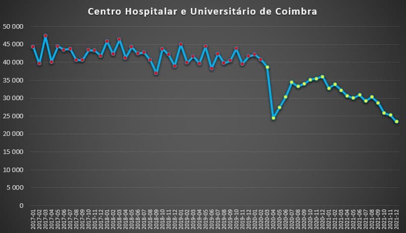 Por exemplo, no Centro Hospitalar e Universitário de Coimbra, a queda no internamento foi impressionante. Antes da pandemia, raramente havia um mês com menos de 40 mil dias de internamento. Em Abril de 2020 desceu para apenas 24.393 dias, uma redução da ordem dos 40%.