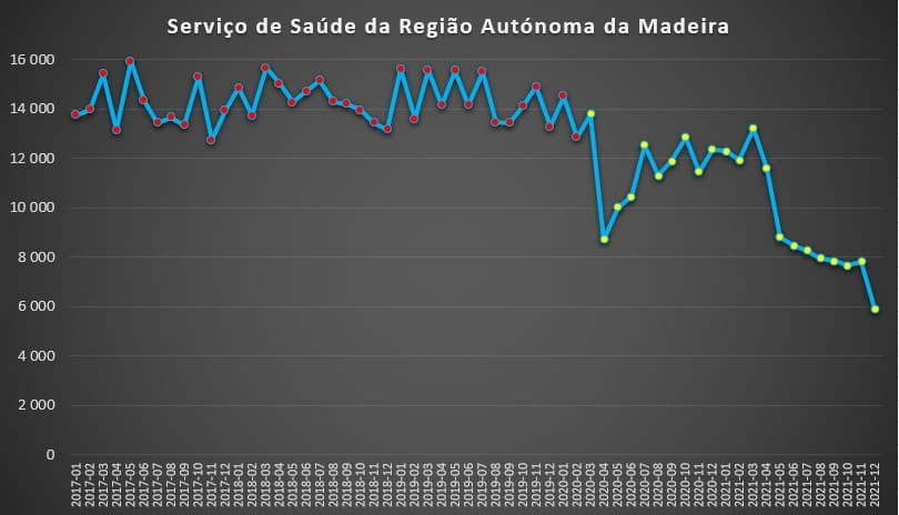 Muito parecida foi a evolução das unidades de saúde na Região Autónoma da Madeira: uma descida abrupta em Abril de 2020, seguindo-se uma “recuperação” para níveis próximos da “normalidade” pré-pandémica, que perdurou até Março de 2021. A partir desse mês registou-se uma queda acentuadíssima, com o valor de Dezembro do ano passado a rondar apenas os seis mil dias de internamento.