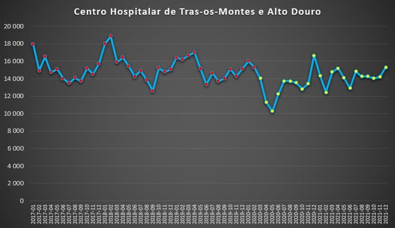 Situação semelhante se viveu no Centro Hospitalar de Trás-os-Montes e Alto Douro – que integra os hospitais de Vila Real, Chaves e Lamego. Houve, efectivamente, uma queda na pressão hospitalar acentuada nos primeiros meses da pandemia, passando de cerca de 14 mil dias de internamento em Março de 2020 para 10 mil em Maio daquele ano, mas depois os valores regressaram aos padrões de “normalidade”.
