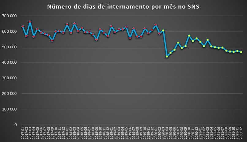 Até Dezembro desse ano, o indicador manteve-se sempre em redor dos 25 mil dias, iniciando depois nova queda acentuada, com excepção de Março de 2021. O mês de Dezembro do ano passado foi um período nunca visto desde 2017: somente 11.566 dias de internamento. Face ao máximo mensal registado no período (40.609 dias em Março de 2018), significa uma queda de 72%.