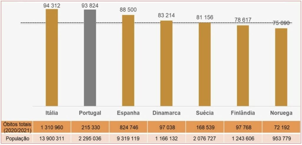 Note-se isso no confronto da mortalidade total – porque, surpresa talvez para os defensores das “medidas tidas por necessárias”, morre-se de muitas outras doenças – entre diversos países latinos e escandinavos durante os anos de 2020 e 2021. Por exemplo, no país que implementou as “medidas tidas por necessárias” – leia-se, Portugal – teve na faixa etária entre os 20 e 65 anos um rácio de mortalidade 70% superior à de certo país que não quis, malvado, implementar as “medidas tidas por necessárias” – leia-se, Suécia.
