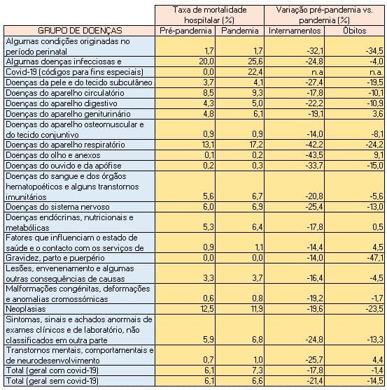 Em termos globais, incluindo a covid-19, e confrontando os dois períodos acima referidos, a taxa de mortalidade hospitalar subiu de 6,1% para 7,3%. Significa que a taxa de mortalidade hospitalar sofreu um agravamento de 20%. Porém, se se retirar os internamentos e óbitos da covid-19, o agravamento para as outras doenças também se verifica, embora em menor grau (mais 9%), passando de 6,1% para 6,6%.