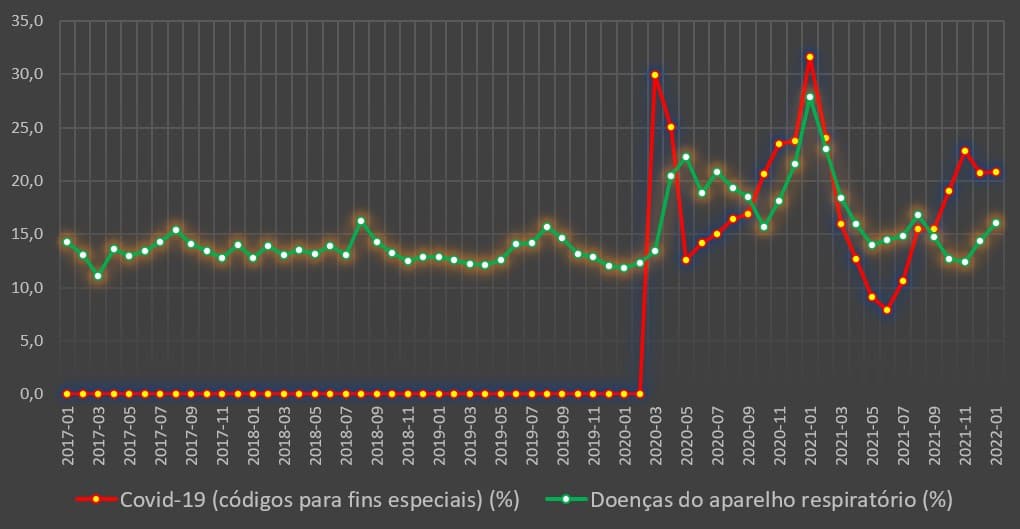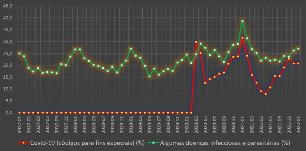 Mas nos casos das doenças infecciosas e parasitárias dos grupos A e B e das doenças do aparelho respiratório a taxa de mortalidade média durante a pandemia foi substancialmente superior à do período anterior. No primeiro grupo subiu de 20,0% para 25,6%; no segundo grupo cresceu de 13,1% para 17,2%.