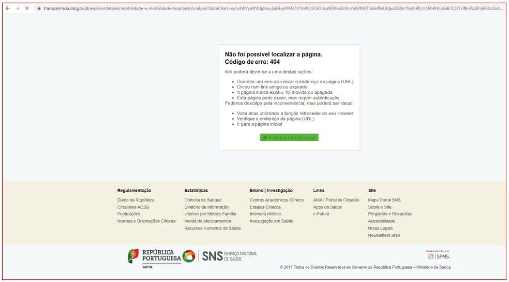 Certo é que, pretendendo o PÁGINA UM actualizar os dados (passando a incluir Fevereiro de 2022), até para desenvolver outra perspectiva de investigação jornalística – neste caso, sobre os internamentos em idade pediátrica –, confrontámo-nos com a pura, singela e abjecta eliminação da base de dados da Morbilidade e Mortalidade Hospitalar do Portal da Transparência do SNS. Desapareceu. Quem quiser agora, pela primeira vez, aceder aos dados, pura e simplesmente nem o sítio lá encontra. Não consegue “sacar” os dados (outrora de acesso público) nem de Janeiro de 2022, nem os de Dezembro de 2021, nem os de Novembro de 2021, nem os de… por aí fora, até Janeiro de 2017. Foi “limpeza” completa.