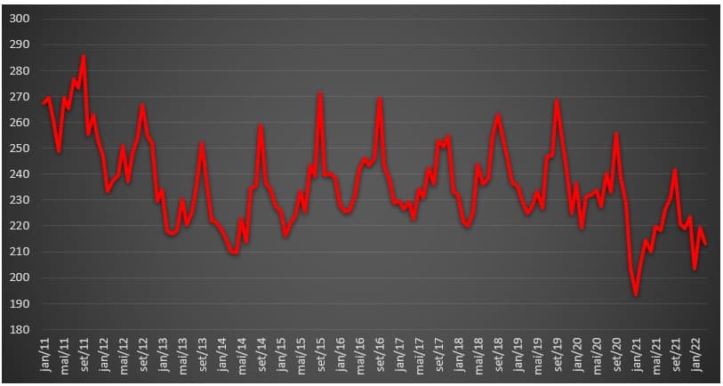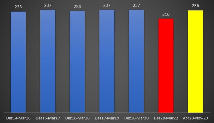 Confrontando este período com os cinco períodos homólogos pré-pandemia – a começar no período de Dezembro de 2014 a Março de 2016 e a terminar no período de Dezembro de 2018 e Março de 2020 –, constata-se uma evidente queda: os nascimentos desde 2014 apresentavam valores relativamente estáveis, em redor dos 235 por dia, pese embora as flutuações mensais.