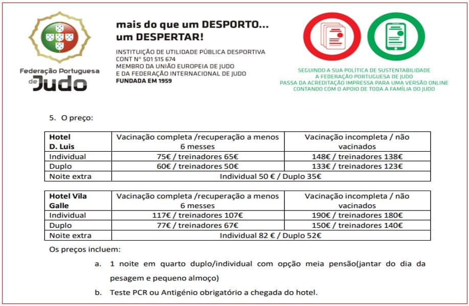 A discriminação explícita de preços consta da circular nº 117/22, assinada ontem pelo próprio presidente da FPJ, Jorge Fernandes, onde, além de se indicarem normas de participação, se impõe a obrigatoriedade de envio do certificado de vacinação ou de recuperação por parte de atletas e treinadores, de modo a assim permitir destrinçar depois o tipo de exigências à chegada para a competição. Estar ou não vacinado tem repercussões no preço da estadia nos dois hotéis escolhidos oficialmente pela FPJ: Villa Galé e D. Luís.