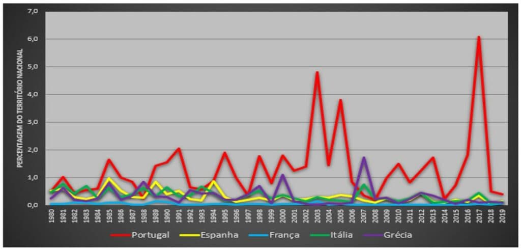 Portugal é o único país da Europa mediterrânica que, desde 1980, aumentou a sua área ardida em termos absolutos. Desde o início do presente século, só dois países registaram anos com uma área ardida superior a 1% do respectivo território: Grécia e Portugal. Mas enquanto a Grécia viu isso suceder apenas duas vezes (2000 e 2007; um pouco menos de 2% de área afectada), tal já sucedeu por 17 vezes em Portugal, das quais 10 vezes no presente século, com um pico de 6% em 2017.