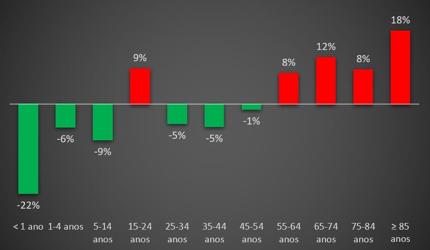 Assim, no grupo dos menores de 1 ano, dos 1 aos 4 anos, dos 5 aos 14 anos, dos 25 aos 34 anos, dos 35 aos 44 anos e dos 45 aos 54 anos – ou seja, com excepção do grupo dos 15 aos 24 anos (situação que deveria ser também investigada) –, a pandemia não teve qualquer impacte, ou até mesmo paradoxalmente “positivo”. A mortalidade foi mesmo inferior. No caso dos menores de 1 ano, a redução até foi de 22% (na realidade um pouco menor, porque a taxa de natalidade desceu).