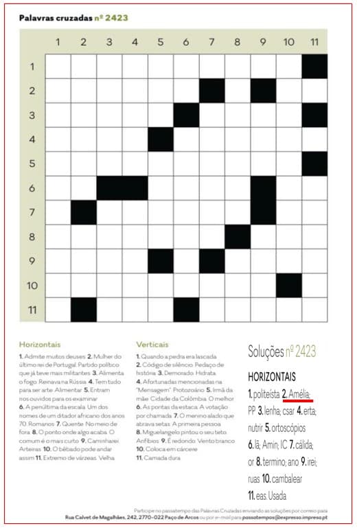 Uma semana depois (Revista Expresso 2592 de 1 de Julho de 2022), lá vinha a solução da 2 Horizontal, seis letras: Amélia. Para o Expresso, a mulher do último rei de Portugal chamava-se Amélia, mulher de D. Carlos e mãe de D. Manuel II.