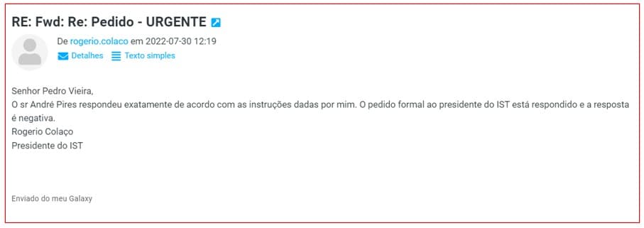 O sr André Pires [assessor de imprensa] respondeu exatamente de acordo com as instruções dadas por mim. O pedido formal ao presidente do IST está respondido e a resposta é negativa”.