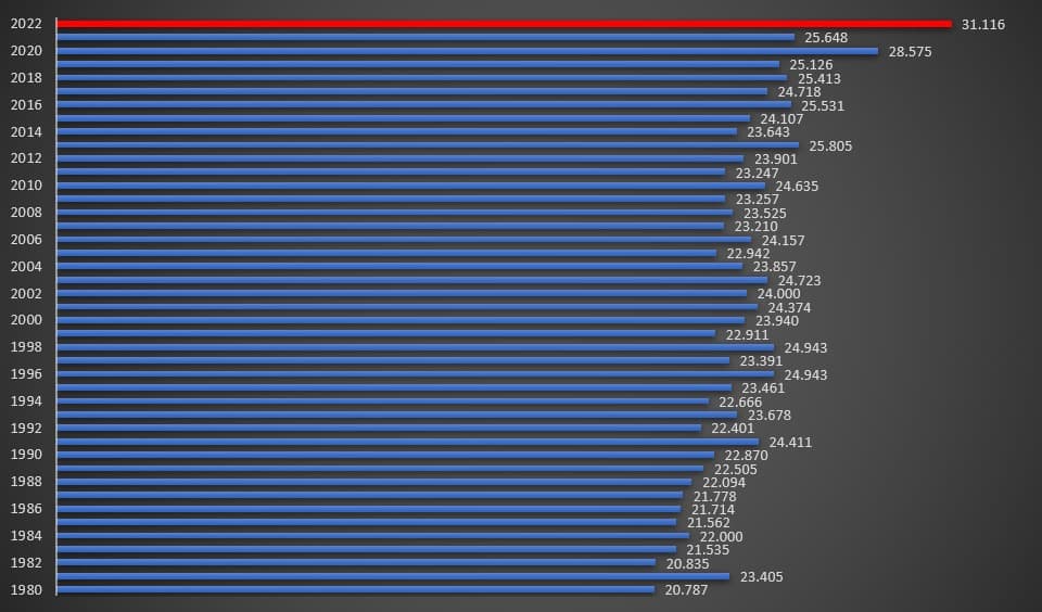E isto incluindo dois dos anos em que a pandemia da covid-19 esteve já presente, um dos quais (2020) sem vacina e com quase toda a população ainda sem contacto com o SARS-CoV-2.