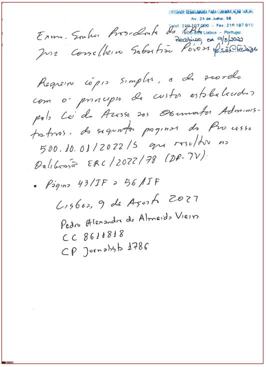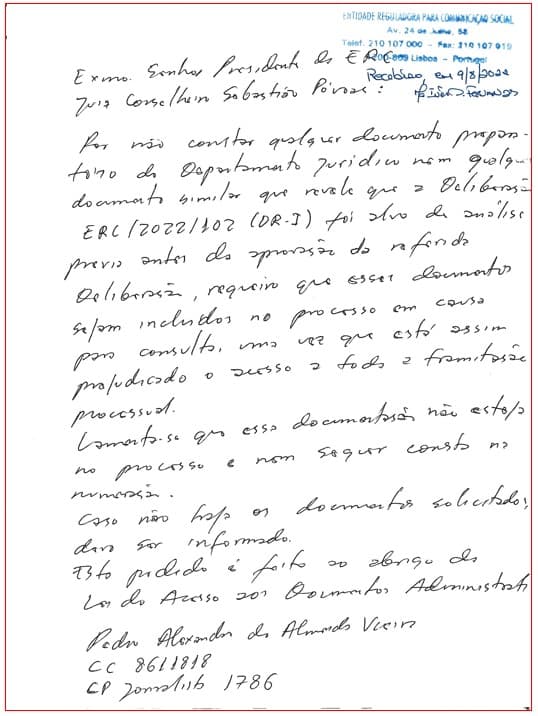 “Hoje, dia 9 de agosto de 2022, um cidadão de nome Pedro de Almeida Vieira dirigiu-se à ERC – Entidade Reguladora para a Comunicação Social sobre [sic] pretexto de consultar processos em que o seu nome está envolvido.