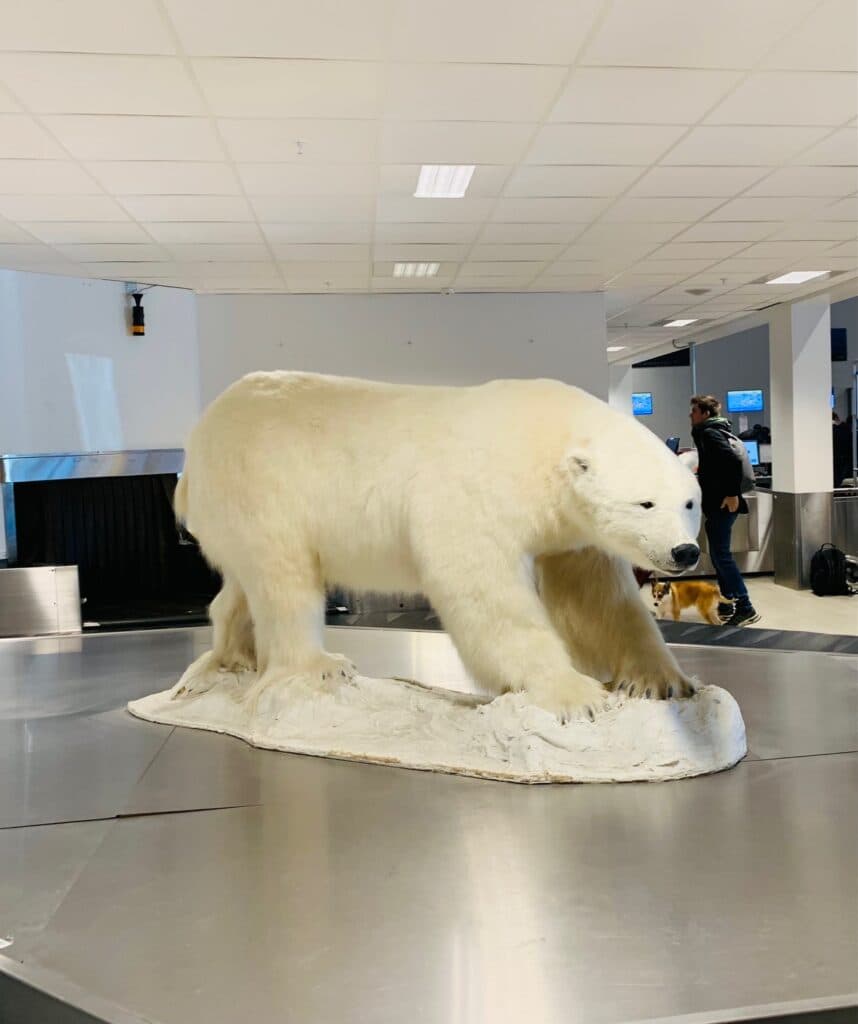 Na chegada ao aeroporto, somos “recebidos” por um “urso polar”, o símbolo do Árctico (o que considerei ser um sinal auspicioso para o meu sonho maior de ver ursos polares no seu habitat – irei precisar de muita sorte para que aconteça).