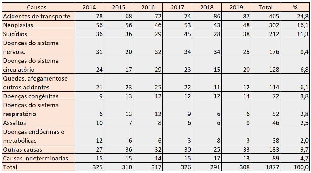 Saliente-se que, de acordo com os dados do Eurostat, entre 2014 e 2019, os acidentes de transporte foram a primeira causa de morte na faixa etária dos 15 aos 24 anos, mas apesar de se considerar que tem um peso muito relevante, representam porém apenas 24,8% do total (465 óbitos em 1.877). Bastante relevantes são as neoplasias que, apesar de raras nestas idades, são a causa de morte em 16,1% dos óbitos totais, seguindo-se os suicídios com 11,2%