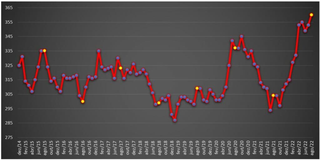 Em Outubro do ano passado chegou aos 297, mas a partir daí tem estado sempre a subir, mostrando uma evolução preocupante. A mortalidade acumulada nos oito meses de 2022 está cerca de 22% acima da média de 2017-2021, conforme divulgou ontem o PÁGINA UM.