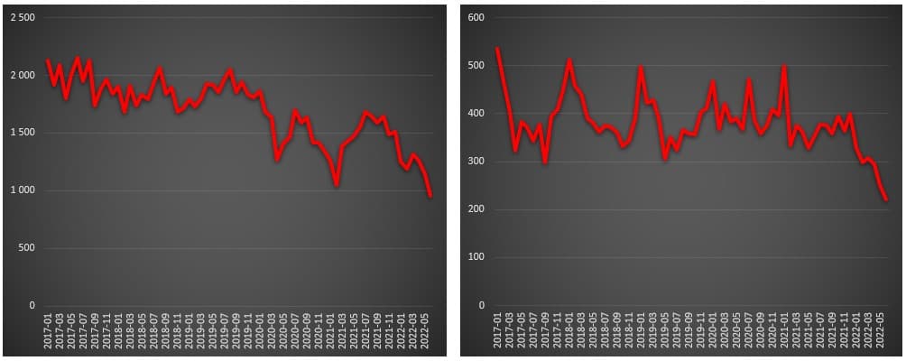 Em termos globais, verifica-se que, desde Janeiro de 2017 – a partir do qual a BDMMH disponibiliza informação –, o mês de Junho de 2022 é o mês que regista o menor número de internamentos (34.487) e o menor número de óbitos (2.394), segundo uma tendência fortemente decrescente a partir de Dezembro do ano passado.