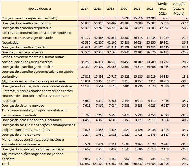 No caso das doenças do aparelho respiratório, a variação é de 47% face ao último quinquénio e de 25% face a 2021, que já fora um ano pouco mortífero, uma vez que as pneumonias virais e bacterianas se reduziram com o surgimento da covid-19.