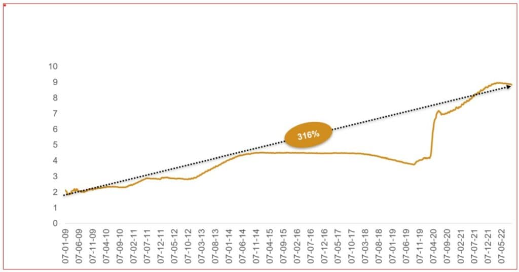 Destaque para o gás natural que subiu 131% até ao final de Agosto de 2022, a um ritmo anual de 411%. Esta subida deve-se, não só à inflação criada pelos Bancos Centrais, mas também à “estúpida” política de sanções da União Europeia (UE).
