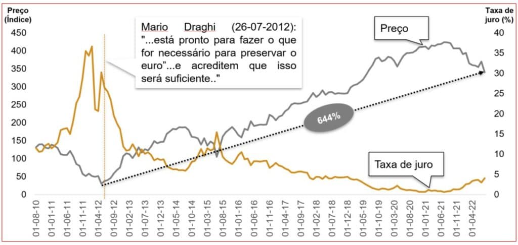 Na figura seguinte podemos ver que inflação foi coisa que “nunca existiu”, em particular para as obrigações gregas que subiram 644%, ao um ritmo anual de 22%, desde o épico anúncio de Mario Draghi até aos nossos dias. Tratou-se de um verdadeiro milagre para um Estado falido, que tem hoje uma dívida pública superior a 220% do PIB e que, antes da ajuda de Mario Draghi, se financiava nos mercados acima de 35%!