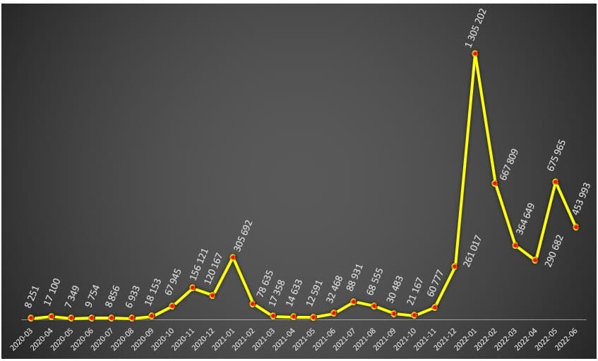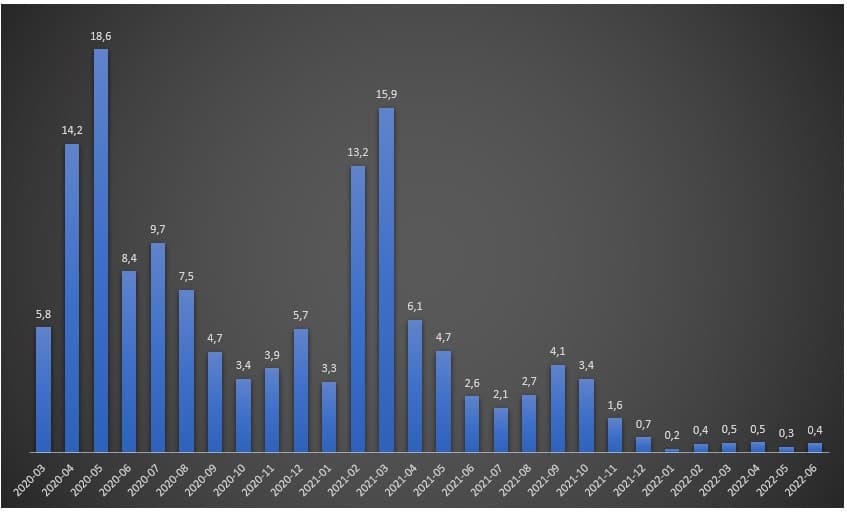 Nos 22 meses anteriores (desde Março de 2020 até Dezembro de 2021) tinha sido “infectada” cerca de 14% da população, dando assim uma média mensal de 0,6%. Mesmo as “infecções” registadas em Janeiro de 2021, que se destacou de todos os outros meses anteriores a 2022, somente “atingiram” 3% da população.