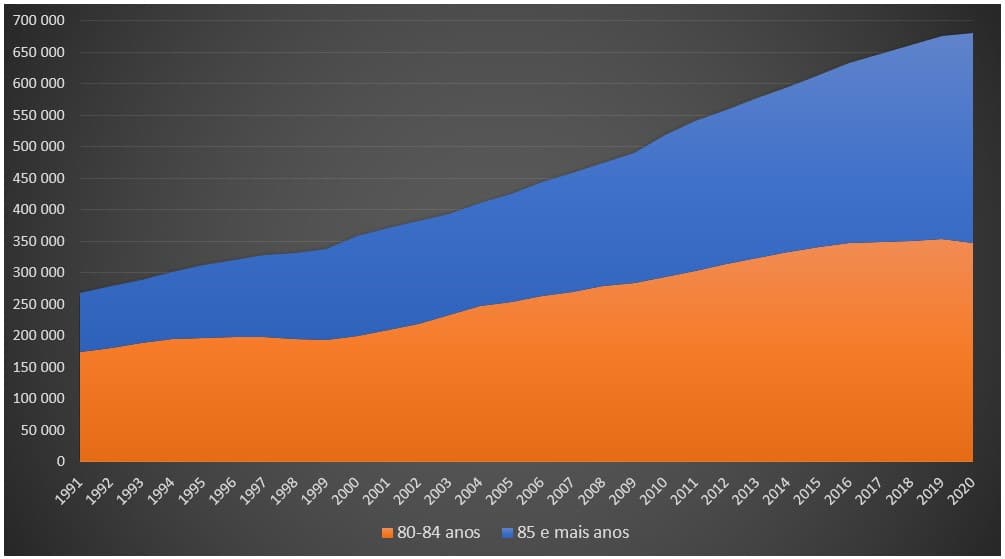Em três décadas, entre 1991 e 2020, Portugal passou a ter mais cerca de 348 mil habitantes, segundo dados do Instituto Nacional de Estatística, mas aumentou o número de muito idosos (acima dos 80 anos) em quase 413 mil. Em 1991, por cada 1.000 portugueses, havia apenas 27 pessoas com mais de 80 anos; no início do século passou para 36; agora, o número é quase o dobro, tendo subido para 67 em cada mil.