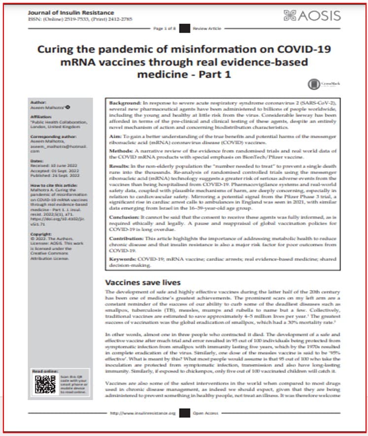 No seu artigo, Aseem Malhotra, professor de Medicina baseada na evidência, e afiliado à Public Health Collaboration, diz que perante os registos dos efeitos adversos e a reduzida eficácia das vacinas na prevenção da infecção e transmissão, sem haver acesso a dados brutos dos ensaios clínicos das vacinas mRNA e na ausência de estudos independentes, a sua administração à população deve ser suspensa.