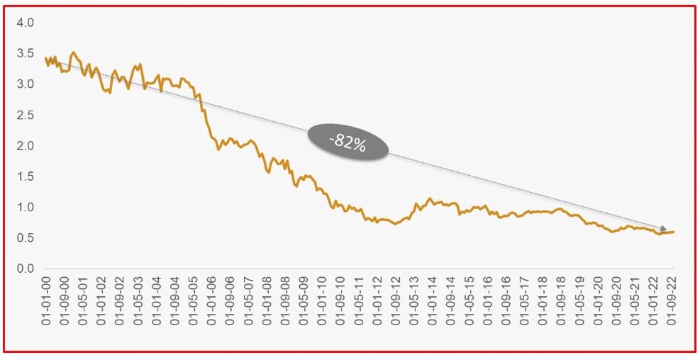 Infelizmente, essa estabilidade de valor é apenas uma miragem! Se cotarmos o Euro em onças de Ouro, a divisa da humanidade durante milénios e que não nasce das árvores como o Euro – basta um apertar do botão para criar biliões de Euros -, verificamos que perdeu 82% (ver Figura 2) do seu valor desde a sua fundação!